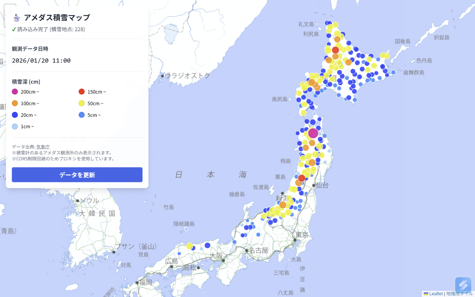 明日からの大雪に備えてオレオレの積雪量チェッカーつくりました アメダス積雪マップ | 全国のアメダス積雪深を可視化 genbuhase.github.io/AMeDAS_Vis