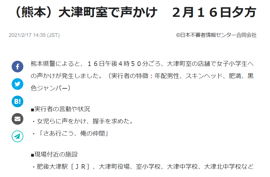 (熊本)大津町室で声かけ 2月16日夕方 | 日本不審者情報センター