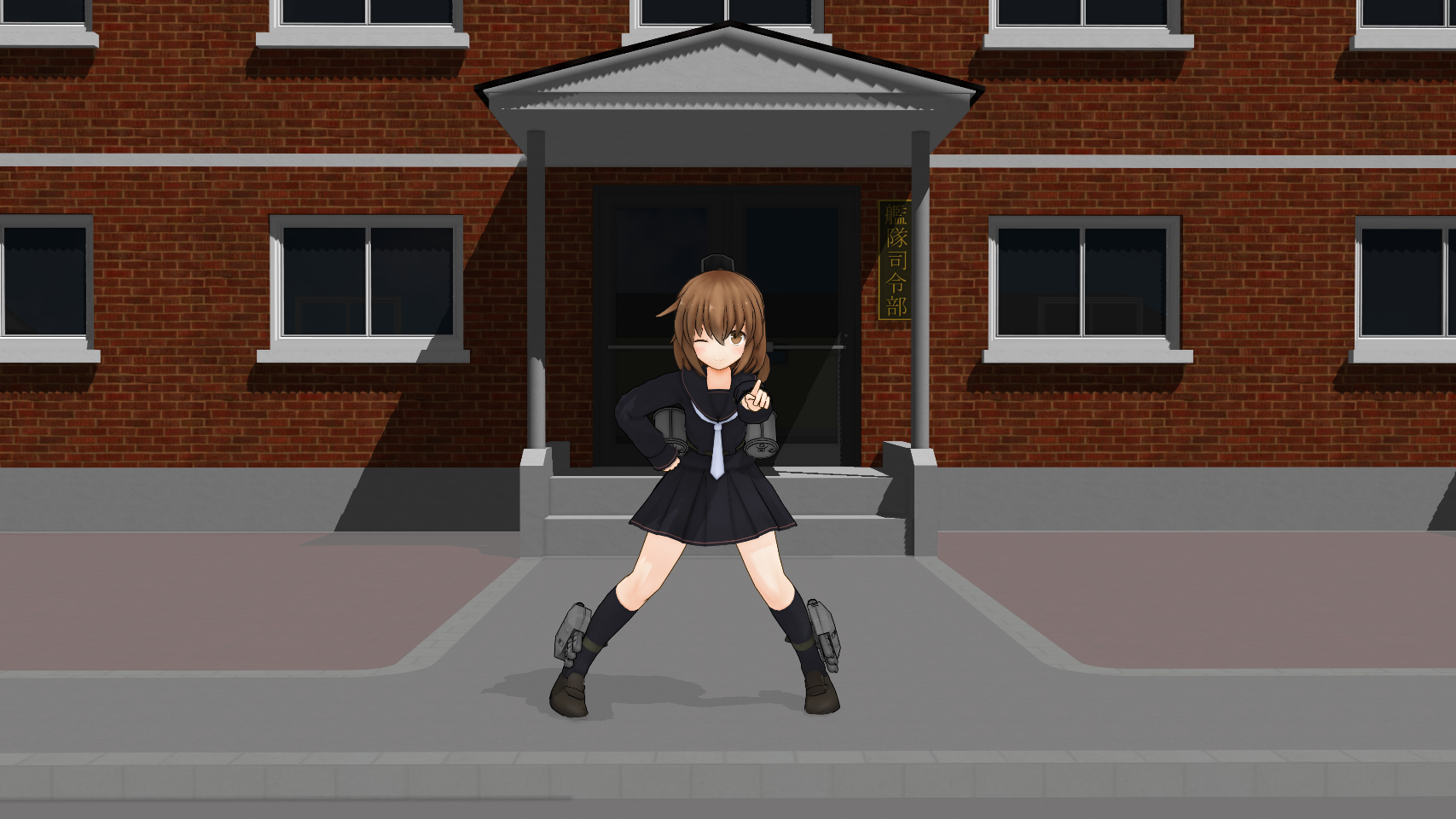 MMDで艦隊司令部の目の前で文月がポーズをとって撮影している図をつくってみた