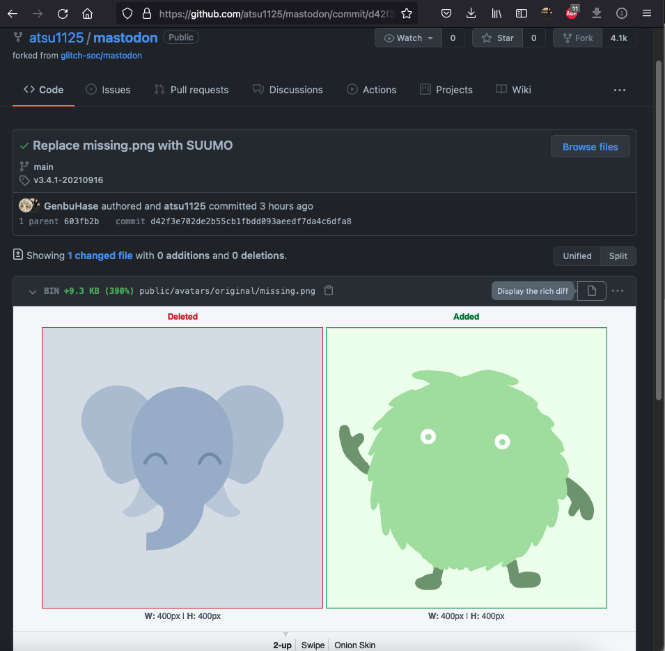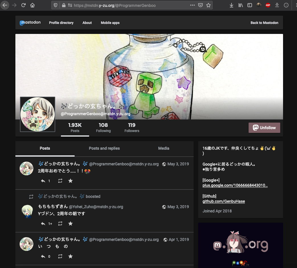 atsu1125/mastodonにも登場しているげんちゃん https://github.com/atsu1125/mastodon/commits?author=GenbuHase